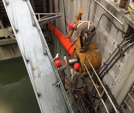 正值汛期,但是水電站的維修不能等。圖為我公司維修人員頂著酷暑,在高溫下對(duì)大型水電站表孔弧形閘門液壓?jiǎn)㈤]機(jī)進(jìn)行大修的現(xiàn)場(chǎng)